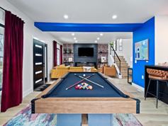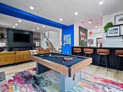 This beautifully renovated home features a cozy living room with a large sectional sofa and electric fireplace, a renovated kitchen with modern appliances and dining for 8, and a game room with a pool table and wet bar. The primary suite includes a king-size bed and an en-suite bathroom with a walk-in shower and soaking tub. Additional bedrooms include a queen-size bed, full-over-full bunk beds with a slide, and an attic suite with two king-size beds and a sitting area. Entertainment options include multiple smart TVs, a basement gaming zone with an Xbox Series S, family games, and cozy seating areas. Enjoy outdoor spaces such as a deck, hot tub, firepit, and a retro-style outdoor van bar.