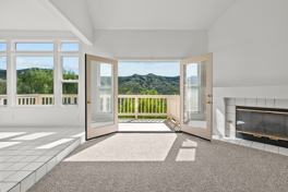 Inside, the home features soaring ceilings, abundant natural light, and a bright open layout designed for comfortable living. The spacious living room with fireplace flows seamlessly into the dining and living areas, with large windows capturing picturesque mountain and hillside views. The interior has been recently refreshed with brand new carpet, professionally refinished, sealed tile and fresh paint throughout, creating a clean, move-in-ready environment.
