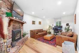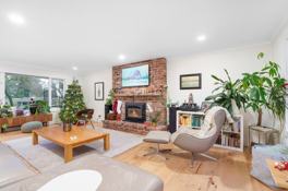 Highlights include a vaulted primary suite with a spa-inspired en-suite and freestanding tub, a chef’s kitchen with island and skylight, multiple lounges, and a fully fenced backyard with a hot tub and BBQ. The bright main living room features a brick fireplace and oversized sectional seating. There is a dedicated dining space seating 6+ with open flow to the kitchen. The chef’s kitchen features a gas cooktop, stone countertops, skylight, and large island. The vaulted primary bedroom has architectural windows and a forest outlook. The spa-inspired en-suite features a freestanding soaking tub, double vanity, and walk-in glass shower. There are three full bathrooms with modern finishes and double-sink vanities.