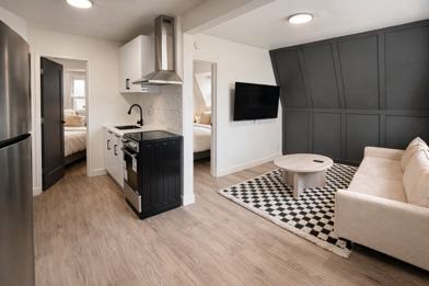 This apartment is located in a walk-up building, so stairs must be used to access the unit. The minimum stay is 30 days, in accordance with local short-term rental regulations. The building is a quiet residential property, and guests are asked to be respectful of neighbors and observe reasonable noise levels. Security cameras are located in the building’s common areas, including hallways and exterior entrances, for safety and security. There are no cameras inside the apartment. On-site shared laundry facilities are available for guest use.