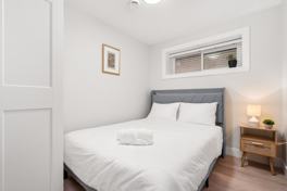 Feel at home in this bright, modern 2-bedroom private basement suite in a quiet East Vancouver neighborhood. There is a short flight of stairs leading down to the entrance.