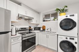 This thoughtfully designed space features a private entrance, stylish living area, full kitchen with stainless steel appliances, and an in-suite washer and dryer. The fully equipped kitchen includes an oven, stovetop, microwave, and fridge. There is also a dining table for meals or work and a cozy living area with a smart TV.