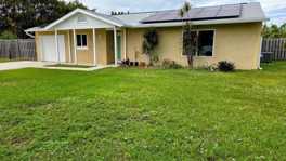 Beautiful 3BR/2BA home near a peaceful lagoon, set on an oversized .31-acre lot east of US-1. Features include impact windows, impact garage door, saltwater pool, solar panels, attic fan, and a 4-year-old roof with gutters. Interior updates include newer appliances, upgraded fans with lights, and a remodeled layout. Home offers a fenced yard, large patios, generator, and an 8x10 shed plus two smaller sheds for storage. Washer and dryer included. A well-maintained property offering comfort, efficiency, and spacious outdoor living in a highly convenient location with easy access to the beach!
