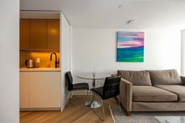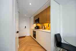 This suite is designed with modern elegance and attention to detail. Beautiful herringbone wood flooring flows throughout, while heated bathroom floors add a touch of luxury and comfort. Large windows fill the space with natural light, creating an open and inviting atmosphere. The combination of clean lines, high-quality finishes, and smart design details ensures a stylish, comfortable, and welcoming space.