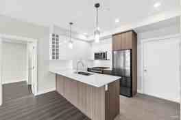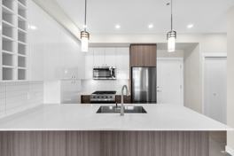 Welcome to 419 - 23200 Gilley Road, Hamilton Village - West. This is a new unit with no previous occupants. This bright space features 2 bedrooms, 2 bathrooms, and a flex space with a total of 861 SF plus a sizable outdoor balcony. The interior is sleek and features both dark and light colored finishes with extensive use of ceramic tile, porcelain tile, laminate floors, and quartz counters. The kitchen focuses on workspace, storage, and a great S/S appliance package, complete with a gas cooktop and built-in wine rack. It also features a breakfast bar area with space to dine or work - your choice. Bedrooms are located on opposite sides of the floor plan, providing privacy with the primary bedroom featuring a walk-in closet and spa-like ensuite. The flex space works perfectly for added storage. Front-loading laundry located in-suite. Included: 1 parking, 1 locker, hot water, and gas included. The unit does have Geothermal heating and cooling. Amenity spaces include: gardens, a playground, and a gym. The building is EV-ready.