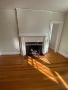 Spacious layout with high ceilings, hardwood floors, ample windows, large living room featuring a fireplace, and generous bedroom with two closets.