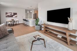 This apartment combines the comforts of home with luxurious amenities. Relax in modern living spaces featuring a 65-inch 4K UHD smart TV, plush seating, and dining spaces. The gourmet kitchen boasts a chef-inspired island, quartz countertops, subway tile backsplashes, and Energy Star®-rated stainless steel appliances. Enjoy the convenience of in-suite laundry, ample storage with full-sized walk-in closets and built-in bookshelves, and stunning city views from floor-to-ceiling windows. For a restful night’s sleep, sink into the ultra-luxe 13-inch high-quality mattress and enjoy the calming interiors with thoughtfully chosen curtain colors and adjustable lighting.