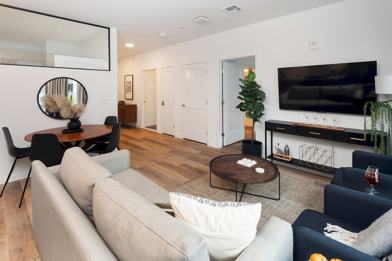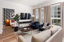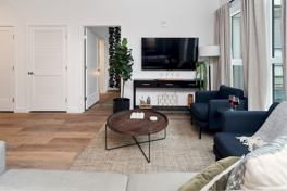 Immerse yourself in sleek, curated living with designer finishes and resort-style amenities. The cozy living spaces feature 55-inch 4K UHD smart TVs, plush seating, and dining spaces. The modern designer kitchen has two-tone flat-front cabinetry, quartz countertops, custom tile backsplashes, spacious islands, floating open shelving, built-in pantries, GE™ Energy Star® stainless-steel appliances, Moen™ matte black fixtures, and an in-suite stackable washer/dryer. Enjoy restful sleep on the ultra-luxe, 13″ euro-top mattress draped in premium linens, blackout drapes, ambient lighting controls, and cozy seating nooks. Oversized windows flood each space with natural light.