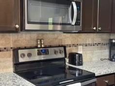This apartment is fully upgraded with stainless appliances, white granite countertops, tile backsplash, and pendant lighting. It is furnished with top-of-the-line appliances and features a large patio with scenic views and a spacious walk-in closet. The master bathroom offers a glass-enclosed shower and tile backsplash.