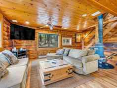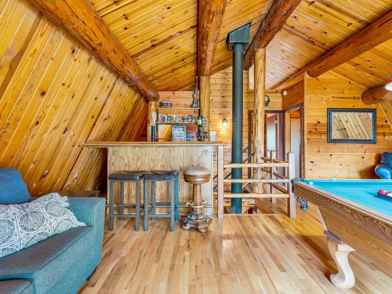 This cabin sleeps 13 and features 4 bedrooms, retro video games, board games, and a stocked kitchen. The main floor includes a full kitchen stocked with coffee and tea, a dining area, a cozy living room with a TV, a full bathroom, and a bedroom with a queen bed. Downstairs is perfect for families or groups, with two bedrooms—one with two full beds and a TV, the other a fun kids' room with two sets of bunk beds and retro video games. Upstairs, unwind in the game loft with a pool table and bar, or step out onto the private balcony off the king-size bedroom. Another full bathroom is also located on this floor. Enjoy the spacious deck with forest views, a ping pong table, a foosball table, and an outdoor dining table.