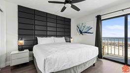 The cozy living area is adorned with a brand-new Samsung Smart TV and a plush black leather sofa, perfect for relaxing after a day of beachfront adventures. The modern kitchen boasts a spacious stainless steel fridge and an intimate dining nook for two. The bathroom is a tranquil oasis featuring an exquisite walk-in tiled shower. The inviting bedroom awaits, featuring a luxurious king-size bed, another Smart TV, and a generous closet for all your belongings. The private balcony offers a breathtaking panoramic view of the sugar-white sands and the mesmerizing Gulf of Mexico.