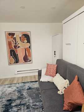Enjoy natural light from two skylights, unwind on a comfy sofa, or relax in a supportive Murphy bed with a Posturepedic mattress. Newly renovated stocked with brand-new appliances: Nespresso machine, airfryer, dishwasher, stove, oven, fridge, washer & dryer—& a rain shower in the bathroom. Also has wardrobe & chest of drawers.