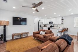 Step inside to a bright and airy open-concept living space, where modern style meets cozy comfort. The living area features comfortable leather sofas. A fully equipped kitchen is ready for you to prepare everything from a quick breakfast to a family dinner. Step outside to a quiet, private yard to enjoy a morning coffee or an evening breeze.