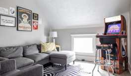 This spacious home features a modern kitchen, a dining room, a living room with a large HDTV, and four cozy bedrooms, including a first floor bedroom with a full bathroom. Entertainment options abound with a full-size NBA Jam arcade game and an “old school” Nintendo preloaded with 620 games for up to four players.