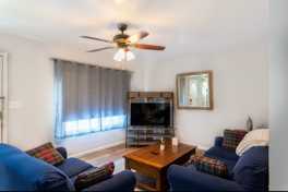 The living area boasts ample natural light, and the well-appointed kitchen features modern appliances and a breakfast bar. The kitchen opens into a dining area that can seat 4. The living room provides a great space to enjoy natural light and quality time watching your favorite show with friends and family. Each bedroom is designed for comfort and equipped with a TV, ceiling fan, and cozy bedding. The outdoor space has a patio ideal for outdoor entertaining and a spacious backyard.