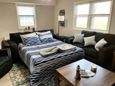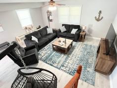 This modern, open-concept living area is designed for comfort and connection. The fully equipped kitchen features a large island with seating for four, a main dining table for group meals, and a seafood pot with tools for an authentic local feast. Unwind on plush sofas in the comfortable living room after a day of exploring. Enjoy the large, fully fenced brick patio featuring a BBQ grill, a cozy outdoor sofa, and an 8-person fire-pit dining table for memorable evenings. An in-unit washer and dryer and a pack ’n play/travel crib are provided for your convenience.