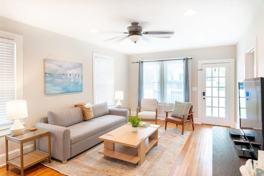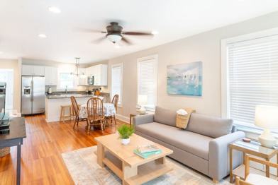 This updated cottage offers a bright and inviting atmosphere. The open-concept living area features a comfortable sofa that converts to a sleeper. The kitchen features stainless steel appliances, granite countertops, and a breakfast bar and is fully equipped for preparing meals. Enjoy the welcoming front porch with rocking chairs and the large, private backyard with a back deck and a fire pit.