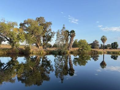 Enjoy stunning sunset views of Mount Diablo surrounded by natural scenery including trees, birds, and flowing water. Outdoor features include a covered deck with hot tub and a fire pit area, perfect for relaxing or entertaining.