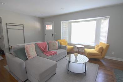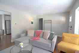 The fully equipped kitchen, living room with ample seating, and large TVs in the living room and one bedroom make this home perfect for a small family, business travelers, or vacationers. The main area includes a foyer with wall art, a bench/rack for shoes and coats, and an umbrella stand. The living room features a plush sofa with large down throw pillows and a comfortable sitting area with a 65" 4k Dolby vision Dolby sound Roku TV. The sofa easily converts to a comfortable queen bed. Two yellow lounge chairs each convert into sleeping cots. There is a modern dining room with seating for 8-10, and a full kitchen with granite countertops, including all cooking and dining materials with plate sets, flatware, glassware, pots/pans, toaster, cooking utensils, spices, condiments, and cooking sauces. Top-of-the-line appliances include a full French door Samsung refrigerator and freezer combo, a Samsung dishwasher with a special third rack for flatware and capacity for 12 dining sets, a Samsung stove/oven and microwave, and an LG stacked front loading washer/dryer combo. There is also a Kitchen aid Mixer, burr coffee grinder, french press, and coffee machine.