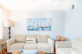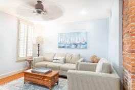 This historic yet modern retreat features an open-concept living area with stylish furnishings and historic exposed brick. The fully equipped kitchen offers modern appliances and an adjacent dining area. Each of the two tranquil bedrooms boasts plush beds and tasteful, coastal-inspired decor. There are two full en-suite bathrooms with contemporary fixtures and complimentary toiletries, plus a convenient half-bathroom on the main level. Outside, a charming, private brick-paved patio is an ideal spot for sipping your morning coffee or unwinding in the evening breeze.