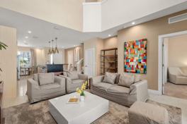 The villa includes a living room, a large full kitchen with stainless steel appliances, spacious indoor and outdoor dining areas, an outdoor patio with a grill and loungers, and a balcony with loungers overlooking the community. You'll also have access to a free washer and dryer.