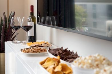 This apartment features a 55-inch 4K UHD smart TV in the living room and bedroom, a spacious living area with a sofa, loveseat, chairs, dining table, and coffee table, and a fully equipped kitchen. It also includes an in-suite washer and dryer and a walk-in closet. The building offers a fireside lounge with HDTVs, a bar, billiards, and shuffleboard. There is also a 24/7 extra-large fitness room with weights, cardio equipment, a climbing wall, spin cycles, and a yoga studio. Enjoy the rooftop sun terrace with grilling stations, chaise lounges, table tennis, and billiards.