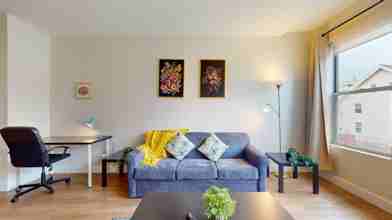 This space includes a bedroom with a queen bed, a living room with a queen sofa bed, and a bathroom with a spacious bathtub and shower. You'll have access to a fully equipped gym, so you don't miss your workout. The apartment also includes a washer and dryer.