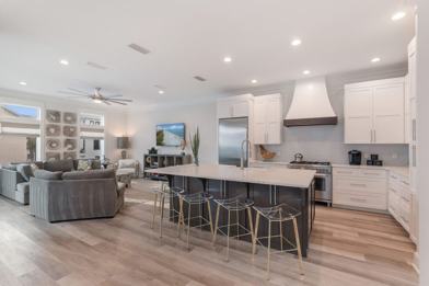 This luxury retreat offers 2,999 square feet of beautifully appointed interiors, featuring an open-concept kitchen, dining area, and family lounge. The chef’s kitchen is fully stocked with high-end stainless steel appliances, granite countertops, custom tile, and a large island with bar seating for six. Each of the five bedrooms is designed as a personal retreat with soft linens and smart TVs. Enjoy a private pool with a gated patio, grill, and outdoor seating. Also included are 4 adult bikes and a 6-seater golf cart.