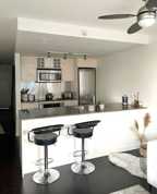The living room features a cozy, yet contemporary set up with a plush sofa, accent chairs and a sleek coffee table. The kitchen is modern, complete with stainless steel appliances, flat panel cabinetry and a generous breakfast bar with seating for two. It flows seamlessly into the living room area, making it perfect for hosting or everyday living.