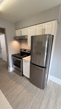 The home features a modern kitchen with updated appliances and in-suite laundry. The bathroom has been tastefully finished with a marble shower and backsplash, delivering a clean, contemporary look.