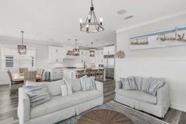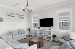 Thoughtfully designed for group getaways, this home features a private pool, multiple Gulf-facing balconies, and two spacious living areas ideal for gathering, unwinding, and making memories. Breezy interiors and curated coastal finishes create a relaxed yet refined atmosphere throughout. The open-concept main living area includes a living room, dining space, and fully stocked kitchen. There is also a downstairs lounge with a wet bar, mini fridge, and casual seating. Dual laundry rooms add comfort and convenience.