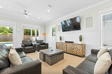 This beautifully appointed five-bedroom residence offers an elevated take on coastal living, designed for guests who value space, style, and comfort. The open-concept living area is both refined and inviting, featuring curated furnishings and a large Smart TV that sets the tone for relaxed evenings and effortless entertaining. The kitchen is fully equipped with modern appliances, generous counter space, and a sleek breakfast bar, ideal for everything from casual mornings to hosting group dinners. A dedicated dining area provides a polished yet comfortable setting for shared meals and memorable gatherings. Each bedroom is thoughtfully designed as a private retreat, offering plush bedding, ample storage, and a calm, restful atmosphere. Multiple en suite bathrooms enhance privacy and convenience, while the loft area with bunk beds adds flexibility for families or larger groups without sacrificing style. Step outside to your private outdoor sanctuary, where a sparkling pool, jetted spa, and grilling area create the perfect backdrop for sun-filled afternoons and relaxed evenings under the coastal sky. Every detail of this home is crafted to deliver a seamless, upscale beach experience. Also included are two laundry areas, one upstairs and one downstairs, and complimentary high-speed Wi-Fi.