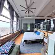 Industrial-style loft at Porter Street Lofts in East Boston with unobstructed park views in Jeffries Point. Features 12' ceilings, oversized windows, and abundant natural light, plus a modern kitchen with stainless steel appliances and space for dining or a home office. Spacious living area fits a large sectional with additional flex space, and the oversized bedroom accommodates a king bed overlooking the park. Includes 2 tandem garage parking spaces, private storage, central AC, in-unit laundry, and hardwood floors. Building amenities include an elevator, shared roof deck, and all just minutes from Logan Airport and the Blue Line. NO PETS!