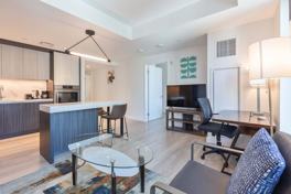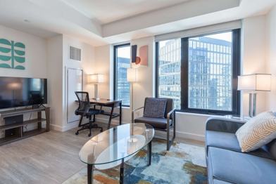 Feel at home in this modern apartment in Boston, featuring floor-to-ceiling windows and smart home technology.