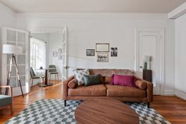 Inside, you’ll find a queen-size bed with blackout curtains and a comfortable living area with a Smart TV. The fully outfitted kitchen includes everything you need to whip up a gourmet meal. Enjoy lots of natural light and A/C in the summer. Free on-site laundry is available on the first floor.