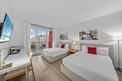 This spacious studio features a private balcony with stunning views, one full bath, and a convenient kitchenette with a mini fridge, microwave, coffee maker, electric kettle, and toaster, ideal for preparing light meals and snacks. Wireless internet is included. The room has two full-sized beds and a TV.