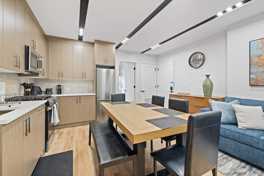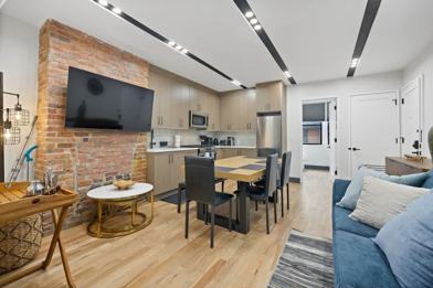This beautifully designed apartment features spacious interiors and exposed brick accents. The living room offers a plush designer sofa and a Smart TV. The fully equipped kitchen includes stainless steel appliances (stove, oven, fridge, microwave, dishwasher) and a coffee station with a drip coffee maker, espresso machine, and Keurig. An in-unit washer and dryer are included for added convenience.