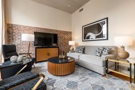 This apartment features a fully equipped kitchen with modern appliances including a refrigerator, stove, microwave, Keurig K-Duo coffee machine, toaster, and dishwasher. The kitchen essentials kit includes paper towels, a dish sponge, dishwasher pods, trash bags, dishwashing liquid, coffee and Keurig pods, creamer, sweetener, salt, pepper, olive oil, and complimentary waters in the fridge. The bathroom essentials kit includes shampoo, conditioner, body wash, a dental kit, a vanity kit, a hair dryer, towels, washcloths, makeup towels, toilet paper, and hand soap. Enjoy high-speed Wi-Fi, smart TVs with DIRECTV satellite programming and popular streaming services in each bedroom and living room, an iron and ironing board, access to shared laundry facilities on every floor, a welcoming lobby area, vending machines, guest guidebooks, and a common rooftop area with downtown views.