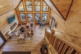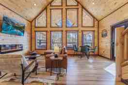 This modern cabin features a warm design that blends natural wood textures with clean, intentional details. The open living area features a vaulted ceiling and a full wall of windows that brings the outdoors in, filling the space with natural light and creating a calm, inviting atmosphere. The living room is designed for comfort with a fireplace, blankets, games, and a stargazing set-up. The fully equipped kitchen is ready for real meals and includes a full set of cookware, utensils, and small appliances like a blender. Relax on the covered deck with a lounge area and a private hot tub or gather around the firepit for a quiet night under the stars.