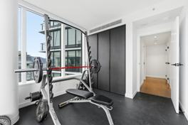 Enjoy a modern kitchen with an island, a full dining area, in-unit laundry, and a dedicated gym/yoga room. The comfortable living area includes a TV and inviting seating. The primary bedroom features a walk-in closet and spa-style en-suite. There are 2.5 bathrooms, including a double vanity and walk-in shower. Enjoy seamless indoor-outdoor living on the private balcony with outdoor seating and panoramic views.