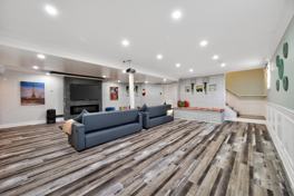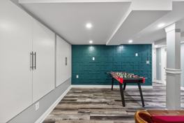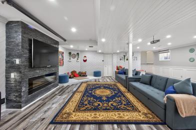 This home is designed for comfort and entertainment, featuring a heated swimming pool, a hot tub, a home theater with a Smart TV and sound system, a large TV in the family room with a comfy sofa, a pool table, foosball, board games, and a basketball hoop. The fully equipped kitchen is ready for all your cooking needs, complemented by a dining area with high chairs and a chair for an infant. There are five full-size washrooms, two of which are en-suite. Enjoy the gym and exercise equipment, two laundry rooms with washers and dryers, and a bar. The exterior boasts a fenced backyard, a BBQ with outdoor patio furniture, a firepit with four relaxing chairs, and a basketball court. The home is professionally cleaned and disinfected before every guest arrives, with freshly washed linens and extra cleaning supplies provided.