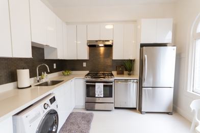 -New kitchen with stainless steel appliances: dishwasher, fridge, gas range