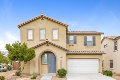 Along with an attached garage and a big enclosed yard, this pet-friendly Las Vegas rental home offers three bedrooms and two and a half bathrooms within 1,831 square feet. The first floor features an open floor plan with big windows and a ceiling fan in the spacious living room. A convenient pass-through window and an arched doorway lead to the kitchen, which has a full set of stainless-steel appliances and plenty of room to dine-in underneath a contemporary chandelier. Sliding glass doors open onto a patio out back. Upstairs, the wood-look flooring and neutral-colored walls lend a modern feel to the primary suite, which comes with a large walk-in closet and an en suite bathroom. Book your tour today!