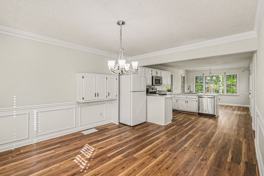 Open concept 36 feet long space centered around the kitchen with two dining areas.