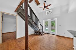 Welcome to this beautifully spacious and inviting home, perfectly situated in a serene, private setting surrounded by mature trees. The heart of the residence is an expansive kitchen featuring granite countertops, a center island, and premium stainless steel appliances, including a side-by-side refrigerator/freezer and dishwasher. The unique architectural design boasts an open-to-below mezzanine, creating a dramatic view from the upper level and enhancing the home's bright, airy feel. The main floor offers a convenient level entry and a flexible bedroom that can easily serve as a home office or cozy family room. High ceilings and central air/heating ensure comfort throughout the seasons. Upstairs, discover generous bedrooms with exceptional closet space, including a primary suite with a private full bathroom. An additional full bathroom on the second floor is thoughtfully combined with the laundry area for maximum convenience. Enjoy the outdoors in your private, cozy front yard or take advantage of the expansive parking area. This quiet retreat is located moments away from Monroe Lake, local parks, and the vibrant shopping and dining options along the 17M corridor. Truly a must-see home that combines privacy with modern amenities.