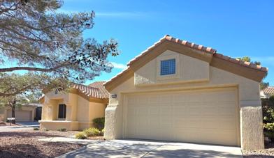 Spacious home situated on a corner lot featuring a fully fenced backyard with a covered patio. The layout includes separate living and family rooms, as well as formal and casual dining areas. There is a cozy breakfast nook connected to the kitchen and family room. The family room has a built-in bookcase for added convenience. The kitchen features stainless steel appliances, hard surface countertops and tile floor. The home features plenty of hard surface flooring, with carpet only in the primary bedroom and living room. Primary bedroom with ceiling fan and walk-in closet. The primary bathroom features dual sinks and a large shower. Easy care desert landscaping. Located in the Sun City Summerlin 55+ community, residents can enjoy access to clubhouses, golf, activities, beautiful grounds, pools and more. Dog is ok.