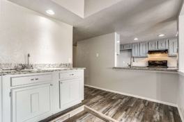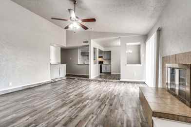Freshly remodeled with luxurious wood-look vinyl plank flooring throughout, plus brand-new carpet in the bedrooms! The semi-open kitchen offers a view into a spacious living room with vaulted ceilings, a built-in wet bar, and a cozy wood-burning fireplace, perfect for entertaining. The kitchen features stylish gray cabinets, granite countertops, and a subway tile backsplash. Both bathrooms include updated vanities and refreshed tub-shower combos. Outside, the large backyard provides plenty of space to play or park an RV or boat.