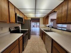 This spacious 2,050 sq ft home in a desirable location perfectly marries Santa Fe charm with modern luxury. The sweeping living space is beautifully accented by exposed wood ceiling beams and an authentic kiva fireplace. Seamless hardwood-style flooring flows throughout the expansive open-concept living area with a separate dining space that also boasts a skylight for terrific natural light. The well-appointed kitchen is equipped with copious storage, stainless steel appliances, a convenient breakfast bar and breakfast nook.