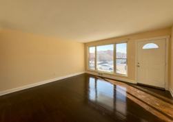 The home is introduced by a front lawn and defined walkway, creating a welcoming approach. Inside, the living area features wood flooring, a wide window that fills the space with natural daylight, and a neutral color palette that provides a bright, open atmosphere ideal for both relaxing and entertaining.