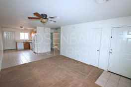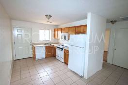The spacious kitchen boasts all essential white appliances, countertop space, and cabinetry, making it both functional and welcoming. Just beyond the kitchen, step into your own private backyard—a peaceful outdoor retreat ideal for relaxing, hosting summer barbecues, or enjoying the serene desert evenings. Practical conveniences include an indoor laundry area with washer and dryer hookups, as well as two dedicated driveway parking spaces for easy access.